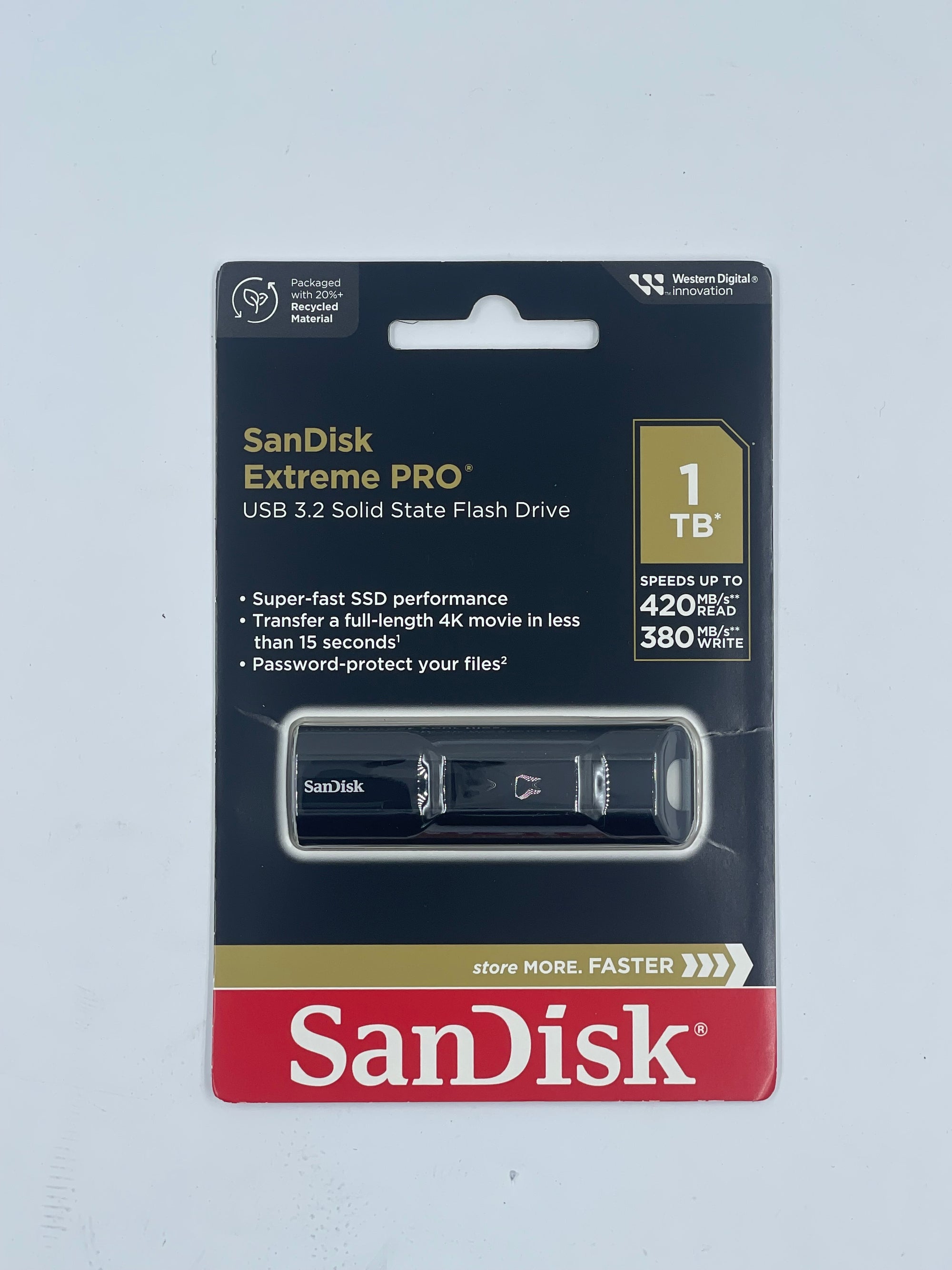 • Included: 1x SanDisk 1TB Extreme PRO USB 3.2 Flash Drive (as packaged by the manufacturer)