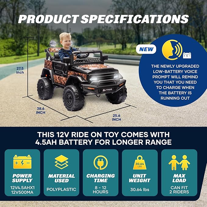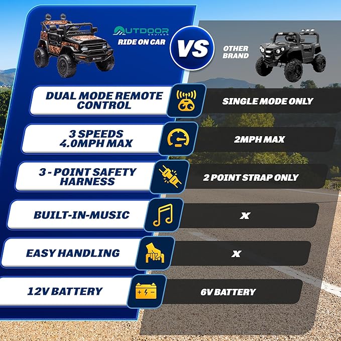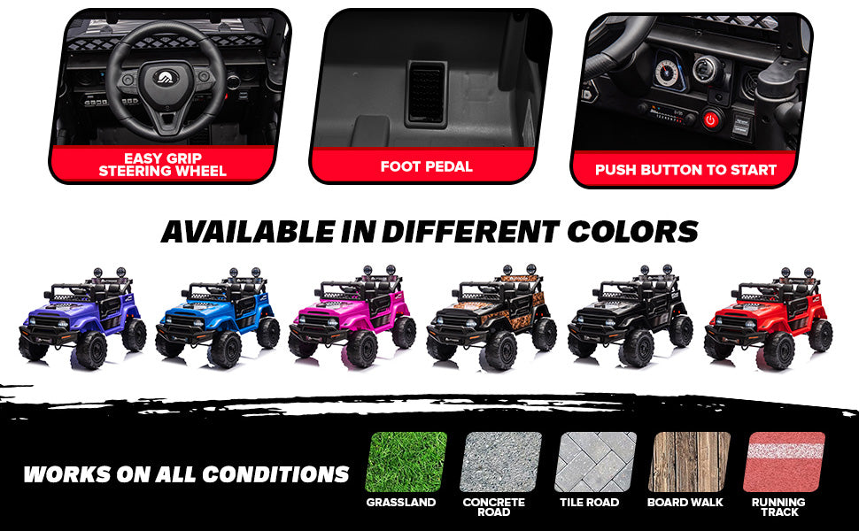 | Driving Modes | Remote Control (Parent) + Manual (Kid) |