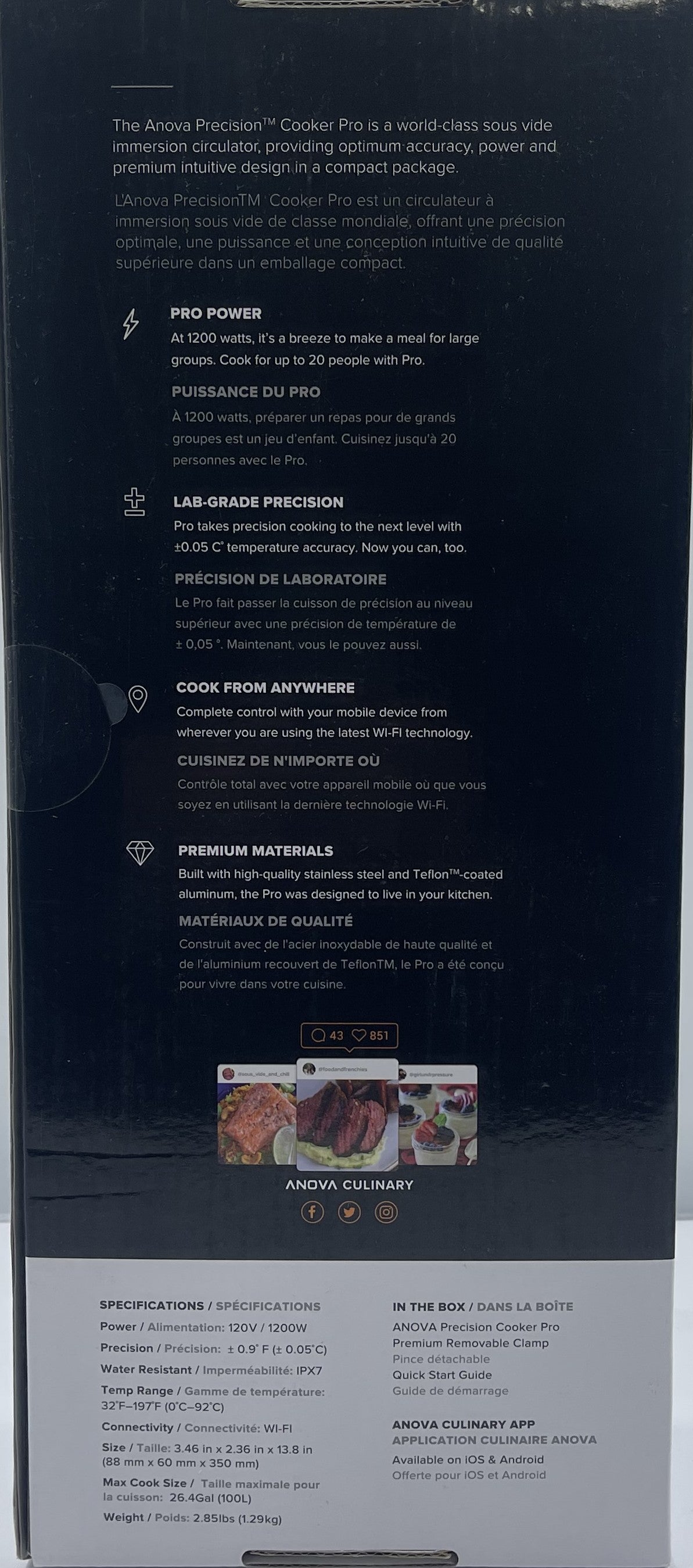 With built-in Wi-Fi and Bluetooth connectivity, the Anova Precision® Pro lets you control your cooks directly from the Anova Culinary app or on the unit itself. Its durable aluminum and stainless-steel construction, combined with high power output, makes it ideal for home cooks who want professional-level performance.
