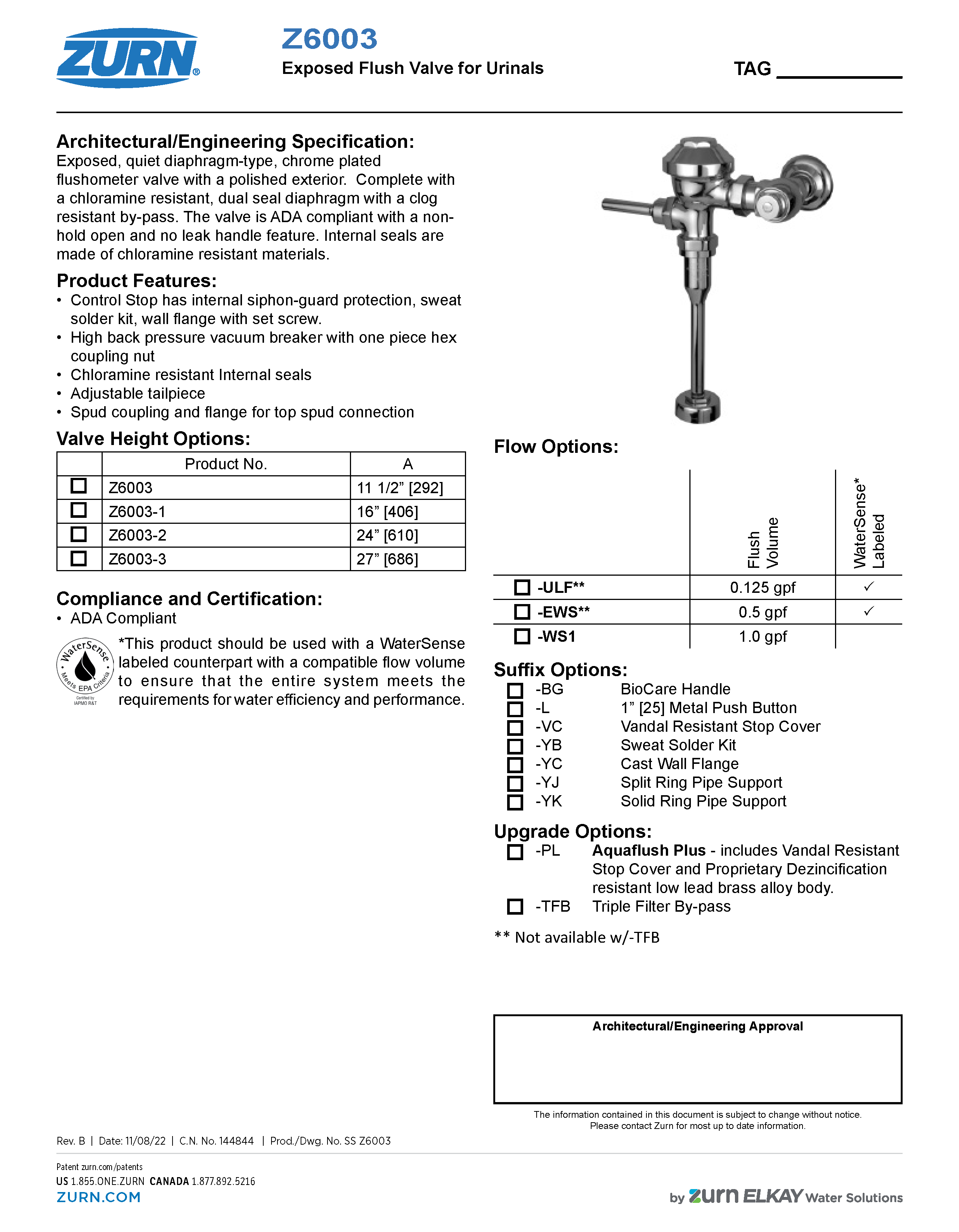 The Zurn Z6003-EWS-YB-YC 0.5 Gal. Urinal Valve with Sweat Solder Adaptor and Wall Flange offers a reliable and sustainable solution for any restroom. Featuring Zurn’s Aquaflush® exposed quiet diaphragm flush valve, this model is designed for efficient water usage and long-lasting performance.